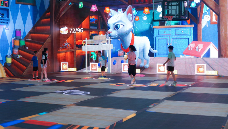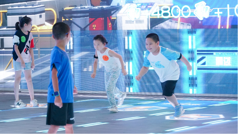 下午,孩子们被带进了一个神奇的展厅,在这里格灵深瞳大规模沉浸式人机交互系统搭建起了一个独特的游戏空间,现实和虚拟的界限被打破。孩子们置身真实世界里,身边却环绕着虚拟的数字景象,可以和周围的伙伴进行游戏竞技,一边是游戏的紧张刺激,一边是人机交互的新奇体验,很快孩子们就沉浸其中。