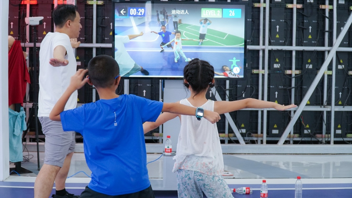 深瞳阿瞳目体感互动系统能够精准捕捉和分析人体动作,无需穿戴设备,智能捕捉骨骼,内置多种运动项目和游戏项目,支持AR交互和双人PK。这次开放了12个游戏项目让“瞳二代”们进行体验,同时设置单项成绩排名,个人赛荣誉榜会展示12个项目所产生的12位冠军个人。
