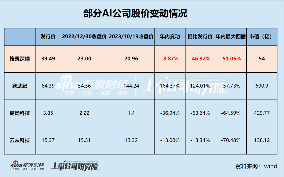 截至2023年10月19日收盘,格灵深瞳的股价为20.96元/股,相比发行价跌幅达46.92%,相比2022年底的23元/股跌幅8.87%,而年内最大回撤(取值区间最高价、最低价进行计算)为-51.06%,市值不足60亿元。由此来看,格灵深瞳基本回吐了今年以来的涨幅。