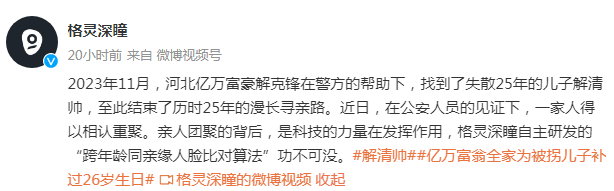 近日,曾悬赏百万寻子的亿万富豪解克锋与失散25年的儿子解清帅终于团圆。随后格灵深瞳公司发文称,“2023年11月,河北‘亿万富豪’解克锋在警方的帮助下,找到了失散25年的儿子解清帅,至此结束了历时25年的漫长寻亲路。近日,在公安人员的见证下,一家人得以相认重聚。亲人团聚的背后,是科技的力量在发挥作用,格灵深瞳自主研发的‘跨年龄同亲缘人脸比对算法’功不可没。”