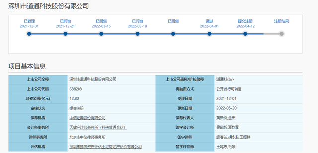 2022年4月12日,深圳市道通科技股份有限公司(以下简称“道通科技”)就“向不特定对象发行可转换公司债券募集”项目向上海证券交易所提交注册。