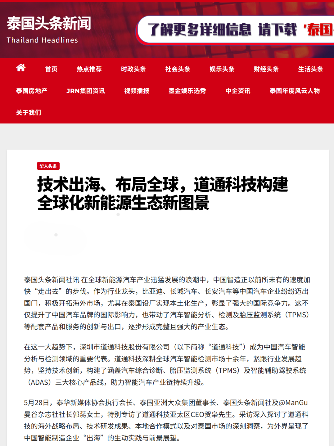 近日,泰华新媒体协会执行会长、泰国亚洲大众集团董事长、泰国头条新闻社及曼谷杂志社社长郭蕊女士,特别专访了道通科技亚太区CEO贺枭。采访深入探讨了道通科技的海外战略布局、技术研发成果、本地合作模式以及对泰国市场的深刻洞察,为外界呈现了中国智能制造企业“全球化”的生动实践与前景展望。