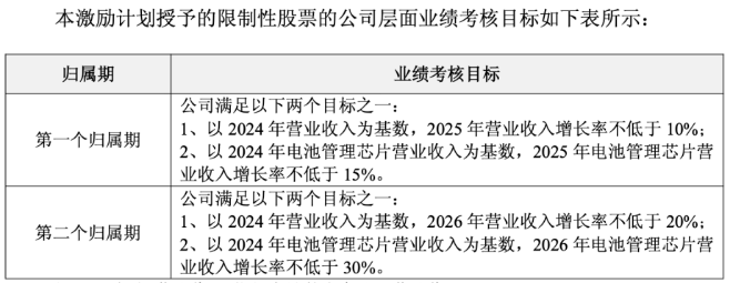本次股权激励考核年度为2025年-2026年,考核指标为“营收增长率”或“电池管理芯片营收增长率”。2025年的考核指标为:以2024年数据作为基数,要求2025年营收增长率不低于10%,或电池管理芯片营业收入增长率不低于15%,两者完成其中一项即可。