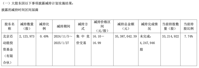 其中,共青城科苑及其一致行动人共持有公司2619.1万股股份,持股比例为6.17%;北京芯动能持股数量为3533.89万股,持股比例为8.32%。上述股份均为IPO时期取得,且已于2023年上市流通。