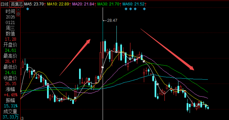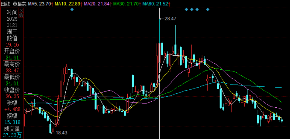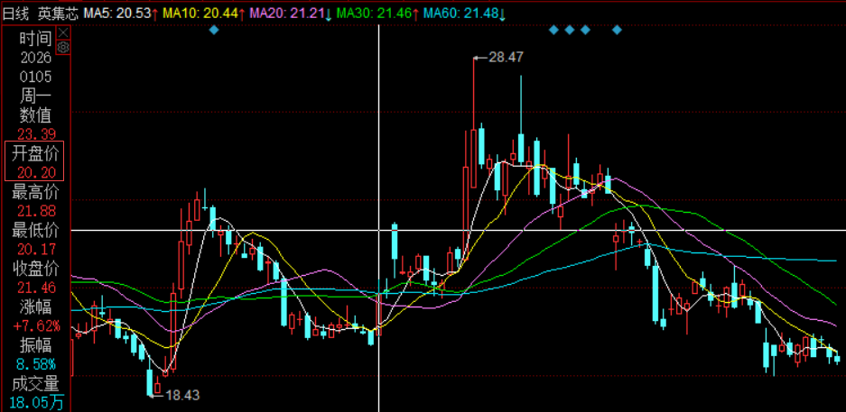 英集芯,1月5日开盘价为20.2元,到1月21日,一路上冲至最高28.47元,如果你能精准把握买入卖出时点,短短半个月你可以收获约40%的盈利。