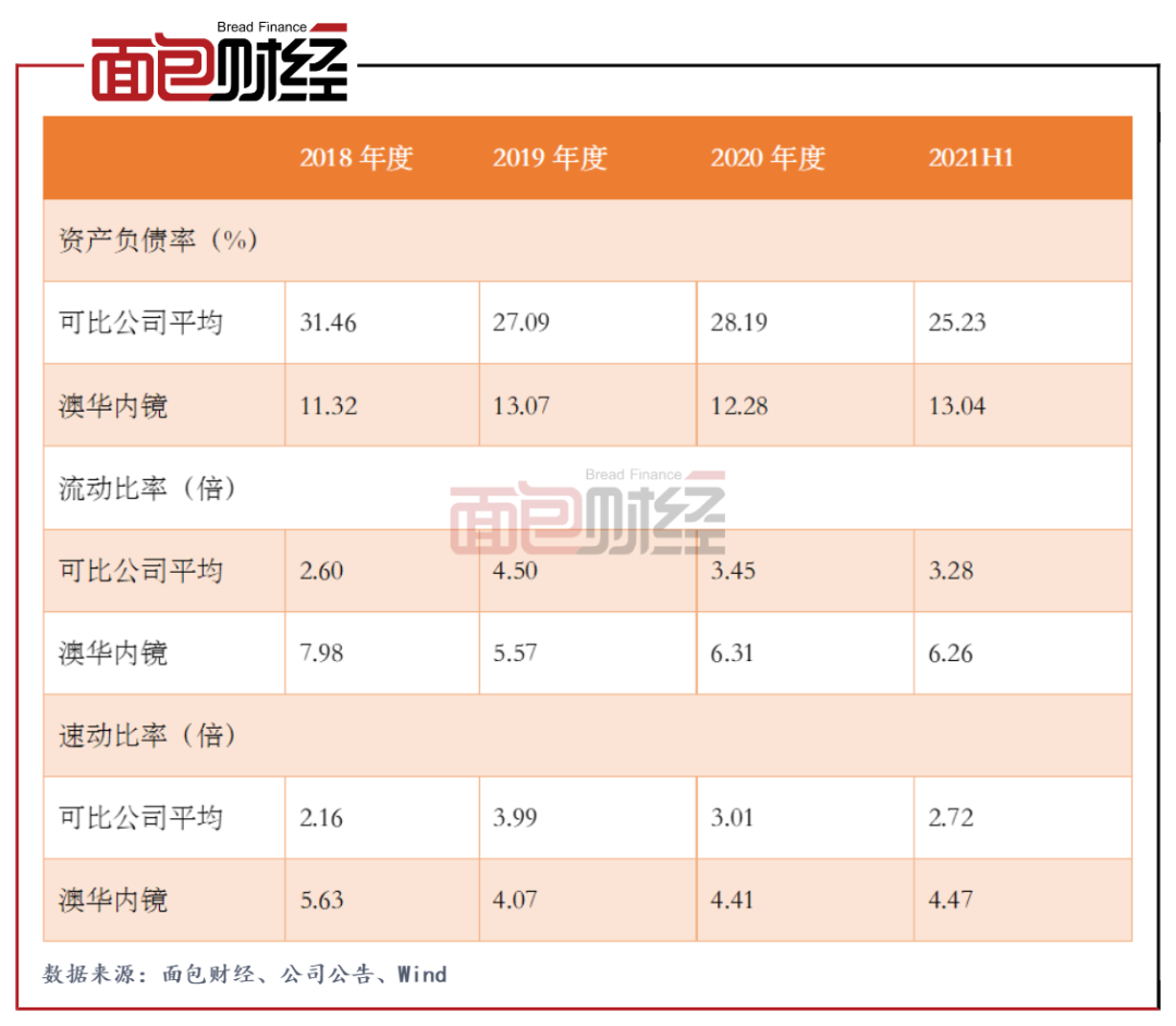 图6:2018年至2021H1澳华内镜与可比上市公司偿债能力指标对比