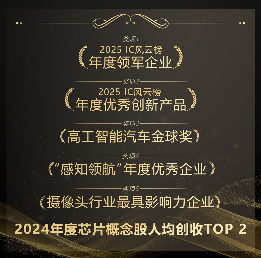 近日,技术先进的CMOS图像传感器供应商思特威(SmartSens,股票代码688213)接连揽获2025 IC风云榜“年度领军企业奖”和高工智能汽车金球奖“年度技术突破奖”等多个行业重磅奖项。在2025 IC风云榜同期公布的“2024年度行业榜单·芯片概念股人均创收(TTM)TOP 100”榜单中,思特威以排名第二的成绩领跑芯片设计行业。此外,思特威还收获了2025 IC风云榜“年度优秀创新产品奖”、第四届感知领航优秀项目“年度优秀企业奖”、“2024摄像头行业年度最具影响力企业奖”等多项荣誉,充分证明了思特威坚实的行业领先地位和卓越的市场影响力。