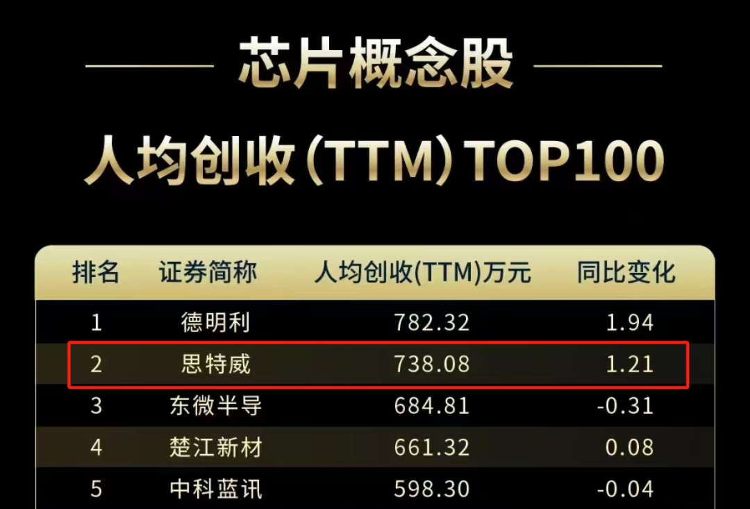 此外,思特威在“2024年度行业榜单·芯片概念股人均创收(TTM)TOP 100”的榜单中位列第二。该排名体现了思特威在技术研发、市场拓展等方面的卓越表现,彰显了其高效的经营能力。