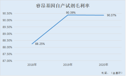 其中,2018-2020年,睿昂基因自产试剂毛利率分别为88.25%、90.39%、90.37%,对主营业务毛利率的贡献度分别为82.05%、89.65%、87.56%,是主营业务毛利率维持高水平的主导因素。