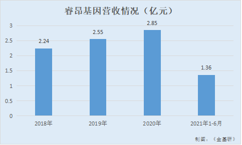 据东方财富Choice数据,2018-2020年及2021年1-6月,睿昂基因实现的营业收入分别为2.24亿元、2.55亿元、2.85亿元、1.36亿元,2019-2020年及2021年1-6月分别同比增长13.83%、11.53%、0.03%。