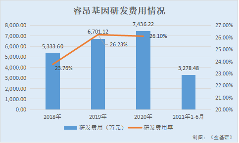 2018-2020年及2021年1-6月,睿昂基因的研发费用分别为5,333.6万元、6,701.12万元、7,436.22万元、3,278.48万元,占当期营业收入的比例分别为23.76%、26.23%、26.1%、24.1%。
