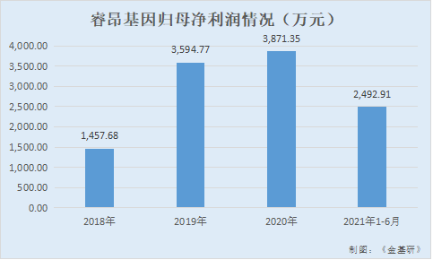 同期,睿昂基因实现的归属于母公司股东的净利润分别为1,457.68万元、3,594.77万元、3,871.35万元、2,492.91万元,2019-2020年及2021年1-6月分别同比增长146.61%、7.69%、81.64%。