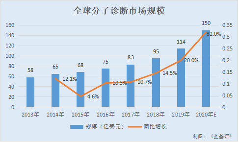 据前瞻网数据,2013-2019年,全球分子诊断市场规模分别为58亿美元、65亿美元、68亿美元、75亿美元、83亿美元、95亿美元、114亿美元,2014-2019年分别同比增长12.1%、4.6%、10.3%、10.7%、14.5%、20%。2020年,预测全球分子诊断市场规模为150亿美元,同比增长32%。