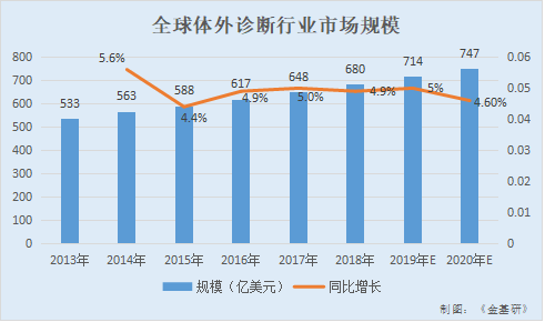 据前瞻网数据,2013-2018年,全球体外诊断行业市场规模分别为533亿美元、563亿美元、588亿美元、617亿美元、648亿美元、680亿美元,2014-2018年分别同比增长5.6%、4.4%、4.9%、5%、4.9%。2019-2020年,预测全球体外诊断行业市场规模分别为714亿美元、747亿美元,分别同比增长5%、4.6%。