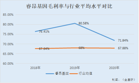 据招股书,睿昂基因11家同行业可比公司2018年至2020年综合毛利率均值分别为67.64%、68%、67.88%。