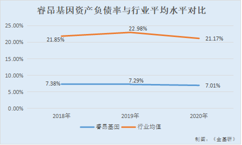另一方面,睿昂基因的资产负债率明显优于同行业平均水平。