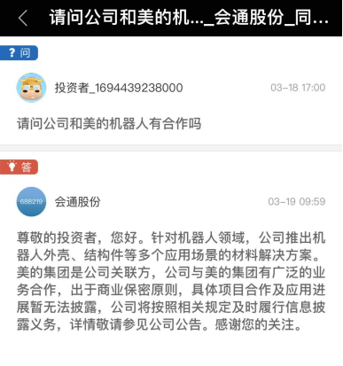 会通股份近日在投资者互动平台高调宣称,已推出“机器人外壳、结构件材料解决方案”,并与美的存在“广泛合作”,但以“商业保密”为由拒绝披露细节。