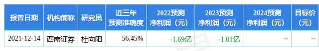 证券之星数据中心根据近三年发布的研报数据计算,西南证券杜向阳研究员团队对该股研究较为深入,近三年预测准确度均值为56.45%,其预测2022年度归属净利润为亏损1.69亿。