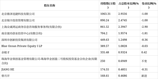 2022年一季度末的公司十大流通股东中,新进股东为曾月开,取代了此前的富兰克林国海中小盘股票型证券投资基金。在具体持股比例上,余根才持股有所上升,北京鼎泽迅捷科技有限公司、北京瑞丰投资管理有限公司、上海众诚鸿运商务信息咨询服务事务所(有限合伙)、南京晟功创业投资中心(有限合伙)、深圳市创新投资集团有限公司、Blue Ocean Private Equity I LP、JIANG HE持股有所下降。
