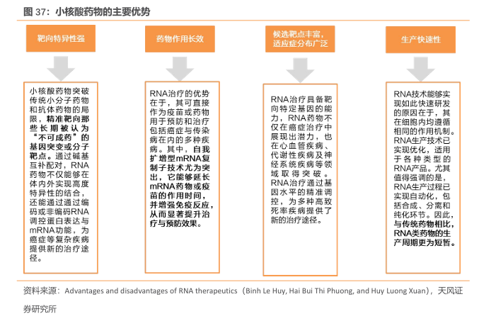 小核酸药物优势明显,包括靶向特异性强、药物作用长效、候选靶点丰富,适应症分布广泛及生产快速性4个优点。