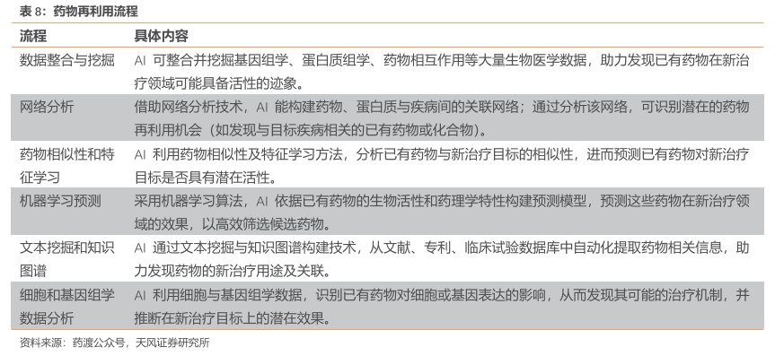 (3)药物再利用(DrugRepurposing):主要使用自然语言处理(NLP)模型和机器学习,通过分析大量非结构化文本数据(研究文章和专利、电子健康记录以及其他类型数据),来构建和搜索可以实现再利用的药物群体。