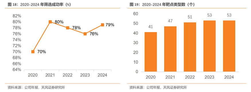 公司领先的DEL技术助力药物发现。截至2024年,公司已经筛选超过 53 类靶点类型、数百个靶点,其中包含蛋白-蛋白相互作用、转录因子、磷酸酶、蛋白复合体、脂肪酶、核酸酶等各种新颖靶点或挑战性的靶点类型。2024年的筛选达到 79%的筛选成功率(重合成后获得功能性的分子的靶点占当期总筛选靶点的比例),筛选项目的平均时间周期缩短至 3 个月以内,达成了 24 个项目的化合物知识产权(IP)转让。截至2024年,公司已累计完成了 110 个项目(>1,100 个活性化合物实体分子)的化合物知识产权转让。
