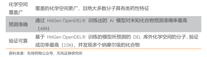 我们认为,成都先导DEL库数据量足,可预测性强,在AI训练中拥有明显优势,有望在随后AI药物发现的赛道中取得良好的成绩。