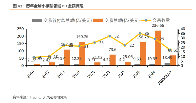 全球小核酸领域交易数量及交易金额整体呈上升趋势。2024年小核酸领域交易金额达236.66亿美元,交易数量29起。