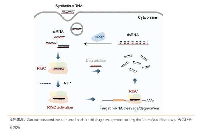 siRNA 的 RNA干扰机制:双链RNA(无论是转录产生的还是人工引入的)被Dicer酶加工为siRNA,并被加载进RISC复合体。随后,siRNA的导向链引导活性RISC识别靶mRNA。siRNA 导向链与靶mRNA之间的完全互补结合,最终导致mRNA的切割。