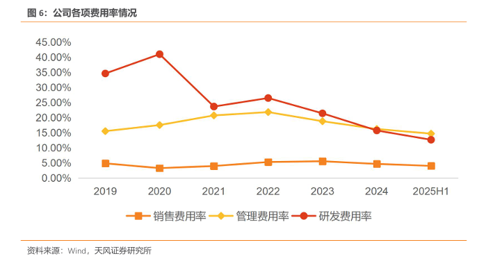 费用率稳步下降,经营效率持续提高。2024年公司销售费用率 4.71%,同比减少 0.87 个百分点,主要系公司针对不同客户的推广力度调整,相关差旅费和会议费有所降低;管理费用 6,937.80 万元,同比减少 0.74%,管理费用率 16.25%,同比减少 2.58 个百分点,主要系股份支付计提金额减少;研发费用 6,732.81 万元,同比减少 15.43%,主要系公司基于战略规划和营运现金流平衡的审慎考虑,对自研管线项目进行聚焦调整,研发费用减少。2025H1,英国子公司Vernalis基于商业化战略考量,主动调整研发资源配置,重点支持商业项目,研发投入同比下降。通过上述结构性调整,集团在保持技术创新能力的同时,实现整体研发费用同比小幅下降,资源配置效率显著提升。