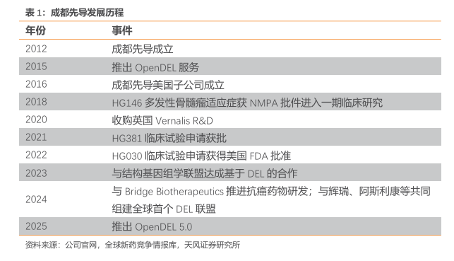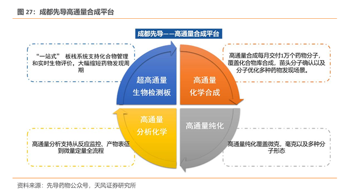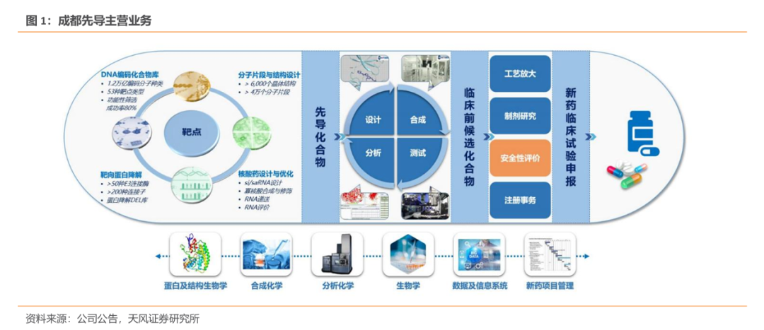 DNA编码化合物库技术平台型公司。成都先导是一家国际化的高科技创新药物研发企业,在英国剑桥、美国休斯顿设有子公司。成都先导聚焦小分子及核酸新药的发现与优化,着力打造了国际领先的DNA编码化合物库技术(包括DEL库的设计、合成和筛选及拓展应用)平台,并拓展了基于分子片段和三维结构信息的药物设计技术(FBDD/SBDD)、寡聚核酸新药研发相关技术(STO)和靶向蛋白降解相关技术(TPD)的核心技术平台。