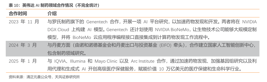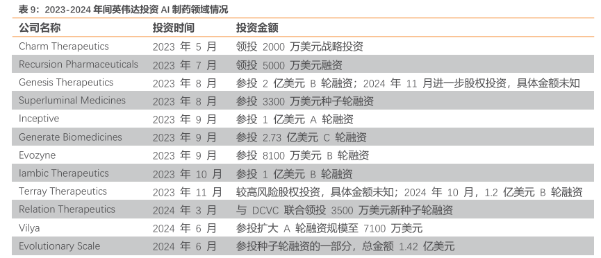 (1)非医药领域:作为代表性企业,在2023年至2024年间,英伟达通过其投资部门NVentures,积极投资了多家AI制药公司。截至2025年4月,英伟达已投资至少13家AI 制药企业。