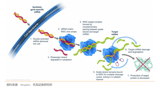 RNAi 疗法核心机制是减少靶蛋白的生成。以siRNA为例,双链siRNA进入细胞后,由RISC复合体加载并解链,保留的引导链与靶mRNA互补配对。引导链保留在RISC中,可进行多次切割循环,起到催化作用。靶mRNA被切割并降解,从而阻止目标蛋白的合成。由于一个RISC复合体可循环使用多个mRNA,RNAi疗法具有高效、特异性强、靶向精准的优势,适用于多种基因相关疾病的治疗。