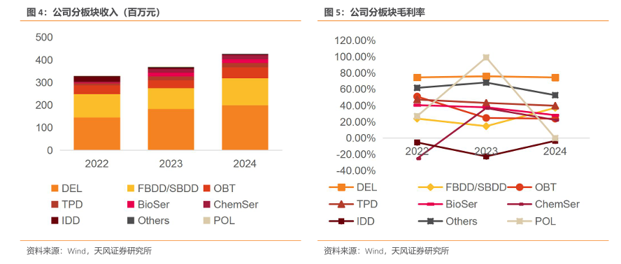 通过 DEL 技术和 FBDD/SBDD 技术的有效整合,公司的能力更加多元化。DEL与FBDD/SBDD 的整合,一方面可提升新药项目发现与优化的成功率,另一方面可给予客户多样化选择,有望在商业模式上推出更多性价比高的服务项目。公司开发了新的 DEL 技术(PAC-FragmentDEL)以针对特定的靶点进行分子片段的发现。现有 4 万余个 DNA 编码的分子片段,可高效快速的针对不同靶点进行片段的发现。同时,公司利用多样性的 DEL中间体进行分子片段的优化,一个月之内将毫摩尔(mM)级别的分子片段优化纳摩尔(nM)级别的苗头化合物,大大缩短了传统的分子片段的优化过程。2024年,公司FBDD/SBDD板块实现收入120.22百万元,同比增长30.99%。