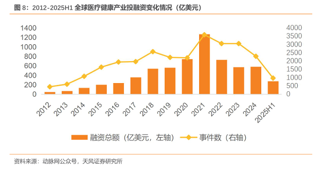 2025H1 全球医疗健康投融资尚未回暖。2025H1,全球共完成医疗健康领域一级市场投资973 笔,累计融资275亿美元,融资总额相对2024H1,下降约10%,融资事件数量由2024H1的1197笔下降约19%。