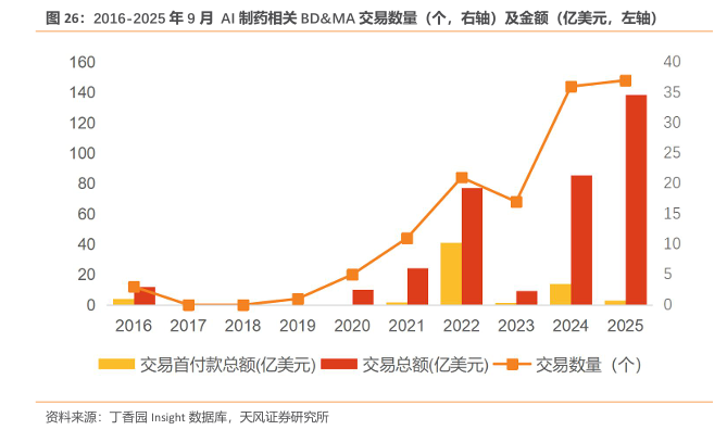 (2)医药领域:2025年6月13日,阿斯利康(AZ)与石药集团达成最高达53亿美元合作,利用石药集团的AI药物发现平台开发小分子候选药物。8月5日,晶泰科技又以一笔总额59.9亿美元的合作,创造AI药物发现合作订单新纪录。考虑到AI对药物研发的明显赋能,我们认为后续AI制药有持续开发潜力,未来有望持续诞生更大金额的BD&MA交易。