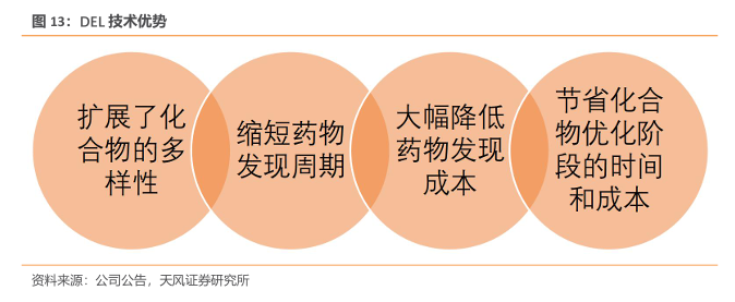DEL 作为一种药物筛选技术,与其他药物发现方法一样,其最直接的目的是发现苗头化合物并根据筛选数据优化得到先导化合物,因此药物筛选技术的商业价值主要体现在发现活性化合物,即苗头化合物这一环节。与传统的高通量筛选相比,DEL技术具有扩展了化合物的多样性、缩短药物发现周期、大幅降低药物发现成本、节省化合物优化阶段的时间和成本等优势。