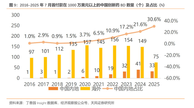 截至2025年7月11日,2025年中国内地首付款在1000万美元以上的license-outBD交易共计33项,占全球总交易数的30.6%,创历史新高。对比2016年(仅1项,占比1.0%),中国十年内相关BD交易数量增长超过30倍,显示出中国企业在高价值资产输出和国际合作方面的显著崛起。2021年以来增长尤为迅速,2023年和2024年连续突破30项,2025年则有望进一步刷新纪录,显示中国已成为全球创新药交易的重要力量。