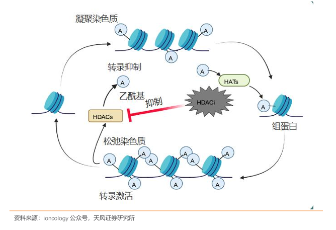 组蛋白去乙酰化酶(histonedeacetylase,HDAC)是一类影响肿瘤表观遗传学改变的关键修饰酶,其功能是去除组蛋白的乙酰化酶-N-乙酰化赖氨酸中的乙酰基。HDAC参与肿瘤细胞生长与表达调控等诸多过程,是表观遗传学中抗肿瘤药物设计的重要靶点。HDAC介导的组蛋白乙酰化水平降低是常见的表观遗传异常,靶向抑制HDAC可逆转乙酰化失调。HDACi 通过调节组蛋白乙酰化水平,影响染色质结构和基因转录,从而实现对肿瘤细胞生长和增殖的抑制。
