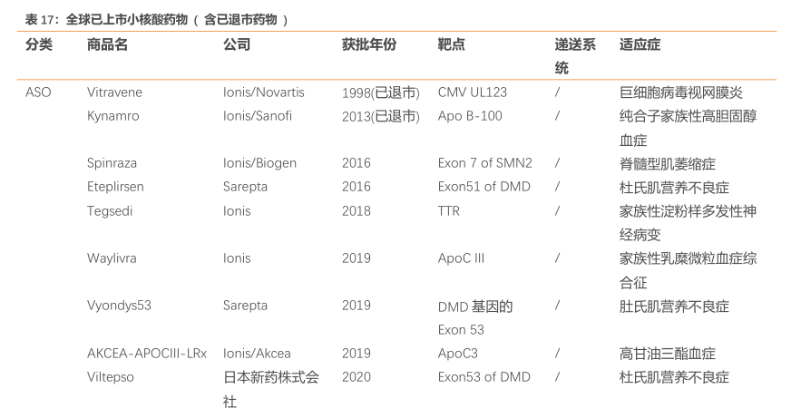 截至 2025年 9月,全球已获批的小核酸药物有22款,包括12款ASO药物、7款siRNA药物、2款配体类药物以及1个寡核苷酸端粒酶抑制剂。其中Vitravene、Macugen、Kynamro三款产品因药品安全性问题或市场竞争等因素已退市。