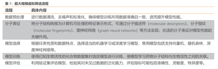 (2)超大规模虚拟筛选:虚拟筛选是一种利用计算机模型和算法对潜在药物分子进行预测和评估的方法,以便从大量的化合物库中,筛选出具有潜在生物活性的候选分子。这种筛选过程是通过在计算机中进行模拟和预测,而不是在实验室中进行物理实验来完成的。虚拟筛选的主要目标是在药物发现的早期阶段,从数百万到数千万个潜在的药物候选分子中,鉴定出可能对特定疾病目标具有生物活性的分子。这有助于加速药物研发过程,减少实验室实验的时间和成本。