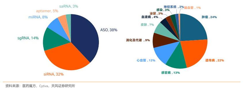 目前, ASO 和 siRNA 仍然是小核酸药物的研发热点,数量分别占比 38%和 32%。从临床管线适应症来看,目前肿瘤已成为小核酸药物临床管线占比最多的适应症,达 24%,其余还有遗传病(22%)、感觉器官疾病(13%)、心血管系统疾病(12%)等。除此之外,小核酸药物也在代谢性疾病,皮肤,血液疾病等领域布局。