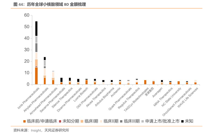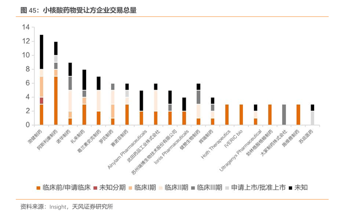 基于转让方企业交易总量来看:IonisPharmaceuticals以51项交易总量占据绝对领先地位,AlnylamPharmaceuticals以19项交易量位列第二,虽不足Ionis的40%,但凭借在临床II期(6项)和上市申请阶段(5项)的活跃表现,稳居第二。ArrowheadPharmaceuticals以9项交易量排名第三,主要集中在临床前(4项)和临床II期(5项)。