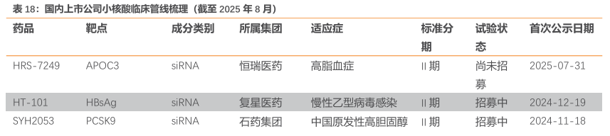 截至2025年8月,国内临床阶段小核酸药物管线主要集中在siRNA类型,共计47项,占比高达72%。其次为ASO类药物,共16项,占比25%。siRNA与其他偶联药物及siRNA外泌体分别仅占1项,各自占比1.5%。