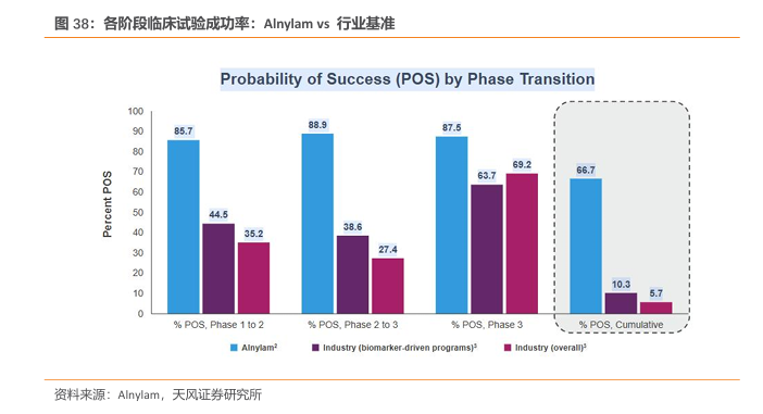 Alnylam RNAi 治疗平台在药物研发各阶段的成功率(POS)显著超出行业平均水平。从I期到II期,Alnylam成功率为85.7%,远高于行业整体的35.2%;从II期到III期,成功率达88.9%,行业仅为27.4%;III 期成功率,Alnylam 为 87.5%,行业为69.2%;累计成功率,Alnylam为66.7%,显著高于行业的5.7%。