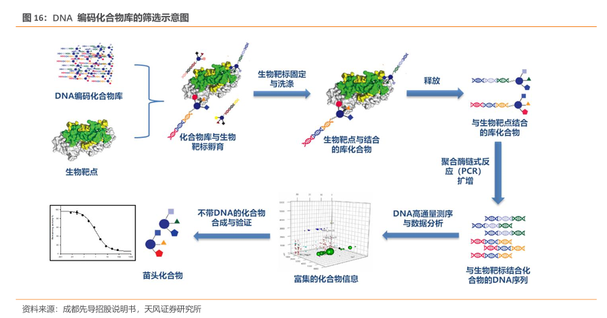 公司经过多年的摸索,建立了核酸合成、DEL 合成、分析和分离的全流程控制,在不断优化合成技术的同时,建立了一套完整的质量控制的流程和方法,确保 DEL 的合成质量。公司使用“先导库”累积筛选上百个生物靶点,筛选结果又反过来可以对库的设计和合成形成有力的支持和反馈,促使整个 DEL 设计和合成技术的提升。