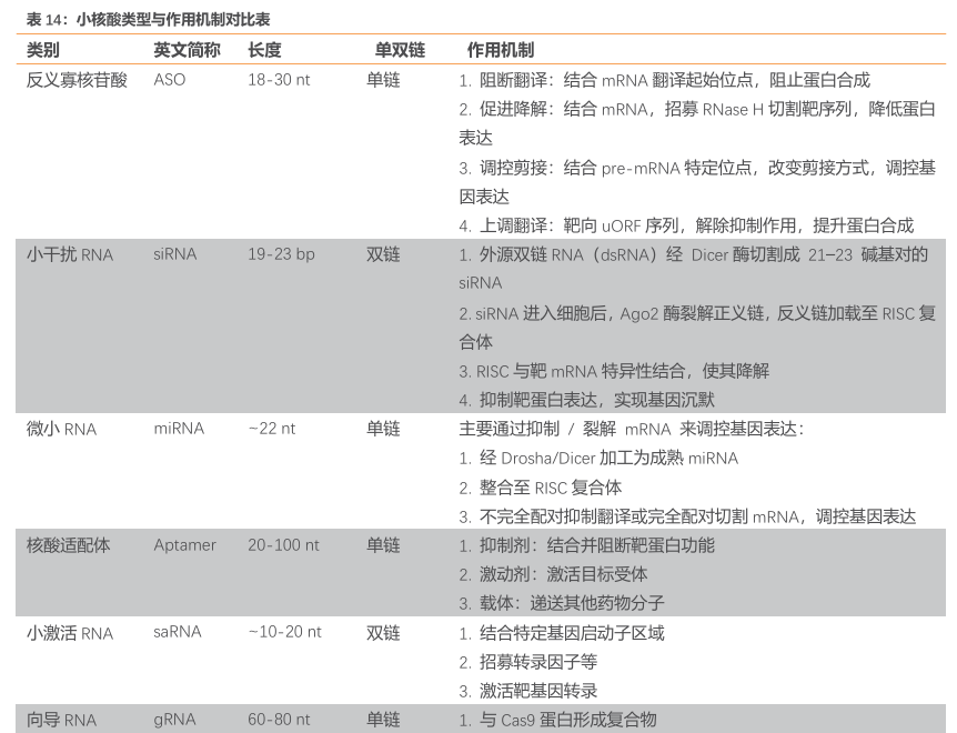 小核酸是化学合成的、短的(通常为15-25个核苷酸)核酸序列,用于调节基因表达水平,通过mRNA转录水平调节达到治疗疾病目的提供了一种直接方法。小核酸药物主要包括小干扰RNA(siRNA)、反义小核酸(ASO)和适配体等,它们通过不同的机制发挥作用,调节基因表达和蛋白质水平,进而调控相应的蛋白质功能。