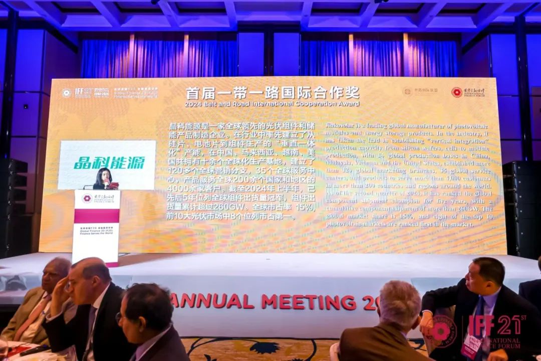 近日,国际金融论坛(IFF)第21届全球年会在香港举行。来自全球 50 多个国家和地区、国际组织的 200 多位财经政要、金融机构、专家学者及业界代表参与论坛并发表演讲,共同探讨全球经济金融领域的新趋势与挑战。晶科能源凭借在“一带一路”国际合作方面的杰出表现,荣获首届“一带一路”国际合作奖,成为唯一获此殊荣的光伏企业。这一奖项是对晶科能源积极参与并推动“一带一路”倡议,并对沿线国家和区域可持续发展所做贡献的高度认可。