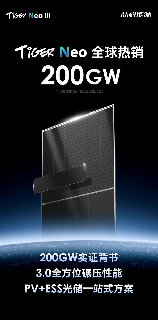 销量持续领跑的背后,是晶科能源作为N型TOPCon技术的坚定推动者,引领中国光伏行业主导技术创新历史性突破。近期,晶科能源在官方微信号宣布,其应用N型TOPCon电池技术的旗舰产品Tiger Neo系列组件全球累计出货量正式突破200GW,产品销往168个国家,其中分布式市场占比40%,创下行业单品销售新纪录,成为史上最畅销的组件系列产品。
