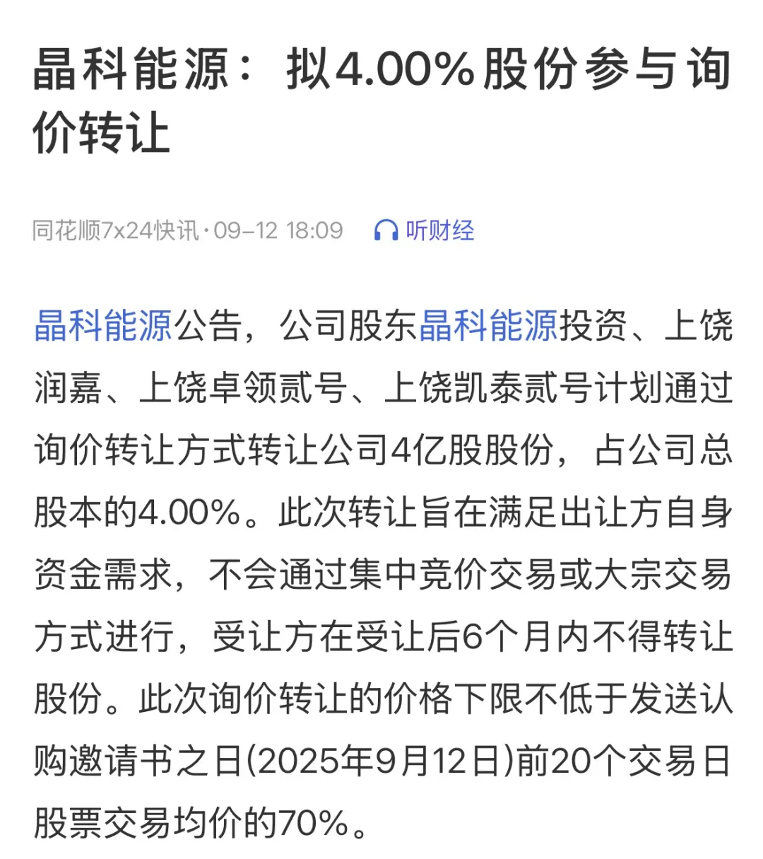 关键是在这个急需信心的关口,晶科先是在9月9日宣布拟作价8000万把子公司晶科新材料80%的股权卖给帝科,接着在9月12日晚宣布晶科能源投资及几个上饶大股东拟采取询价转让方式,合计出让4亿股,占总股本的4%,预计可以套现20亿...